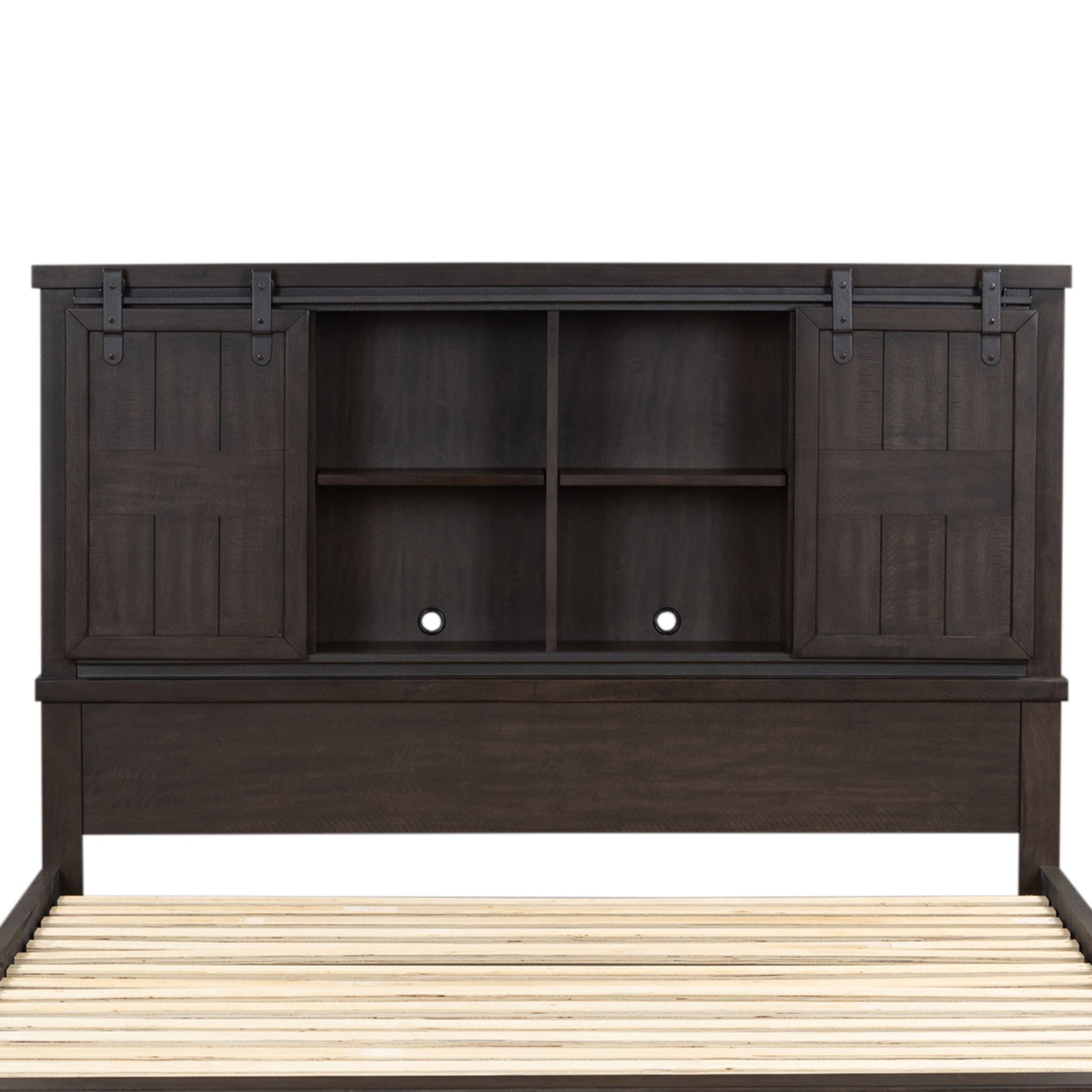 Features barn door style sliding doors with one adjustable shelf in each compartment. Cannot stand alone. Pair with the panel or storage footboard and rails for a complete bed.