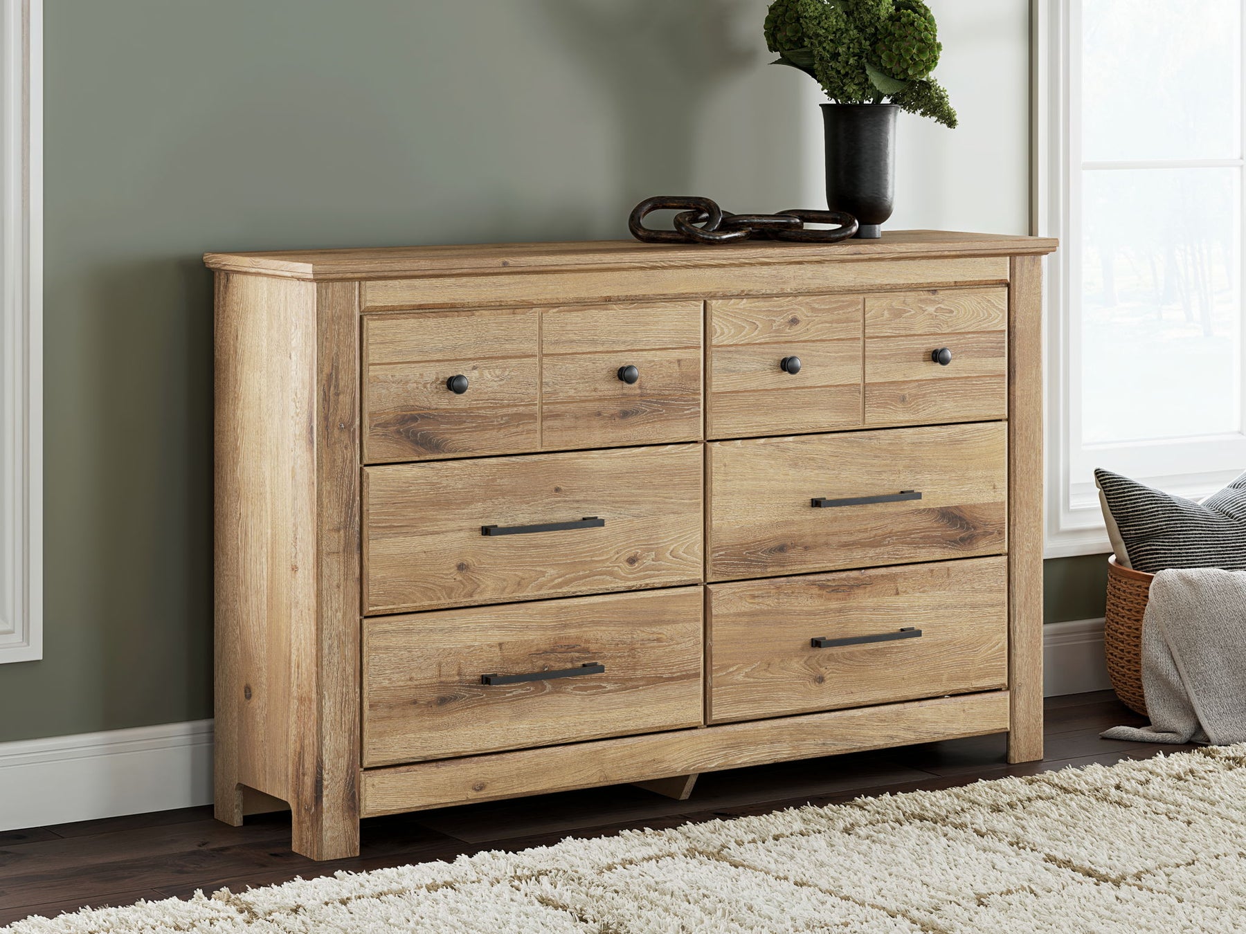 Looking to create a bedroom that feels airy and beautifully put together? This casually comfy dresser is your perfect solution. Its clean lines, replicated oak grain and on-trend finish exude a charming cottage-inspired feel that brightens your restful retreat. Spacious drawers with dark bronze-tone knobs stow away clothes and more. Now there’s a fresh take on country living we can get behind.