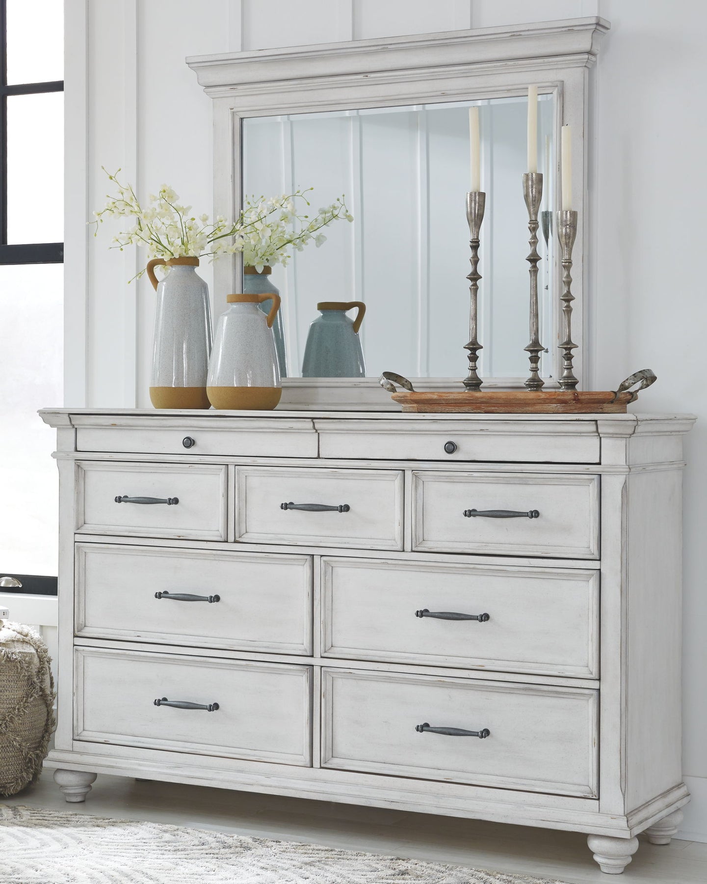 Give your retreat vintage charm and valuable drawer storage with this dresser. In a beautifully distressed whitewash finish, you'll love putting it all away in casual style. Seven full-sized drawers and two accessory top drawers will easily accommodate your needs. Generously scaled moulding from top to bottom, along with bun feet and drawer handles with a transitional aesthetic, give this dresser character—evoking the feel of a quaint cottage escape.