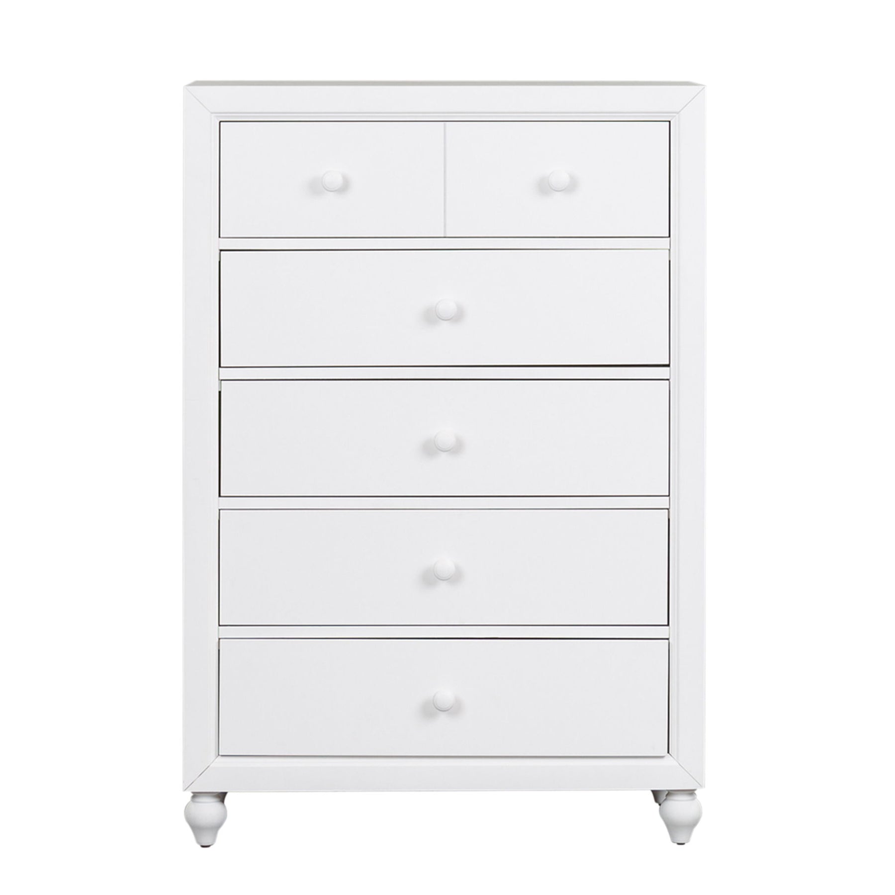 Indulge in cottage design with the Cottage View 5 drawer chest. Crafted by melamine and a rubberwood solid frame, this piece features kenlin drawer glides, bottom case dust proofing, solid wood picture framed molding, laminate drawer interior, bluff cut top drawers, wood knob hardware, and is anchored by bun feet. This piece is available in an alternate finish and the melamine is scratch resistant, sure to make this piece last in any home.
