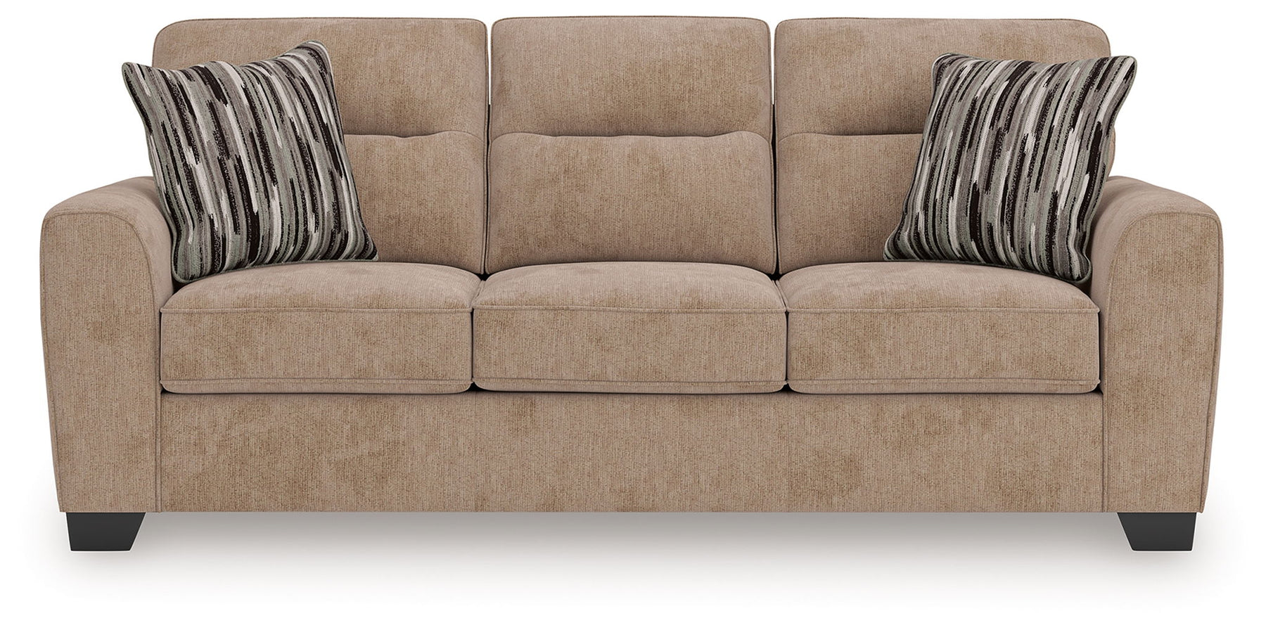 Strike a balance between the indulgent comfort you crave and the contemporary aesthetic you long for. The fabulously soft, mocha-colored upholstery of this sofa takes neutrals to new heights. Plus there's plenty of room to spread out and relax solo or with your bestie. Geometric-patterned accent pillows perfect the richly on-trend aesthetic.