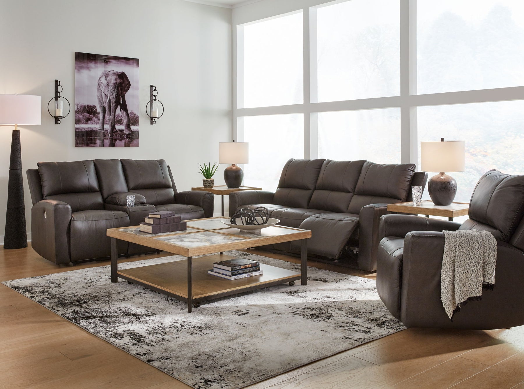 Experience modern luxury with this living room package. The soft-to-the-touch leather and faux leather upholstery brings ultimate relaxation at a price you can afford. With sleek arms and a plush, pillowy back, the set merges comfort and support with a high-style design.