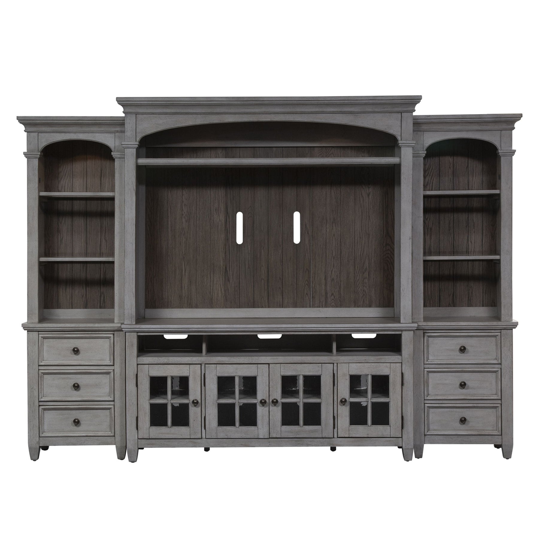 Accent your living room with the perfect vintage design, using this unique and stylish entertainment center. Crafted with rubberwood solids, bottom case dust proofing, wood framed glass doors, additional shelving in the hutch, LED touch lighting to illuminate the piece, is anchored by heavy tapered feet and accented by timeless antiqued brass knob hardware, and can accommodate most 65" TVs. With today's modern technology in mind, users can enjoy the convenience of the open compartment areas and wire management provisions to hide those pesky wires from your DVD player or gaming console of choice.