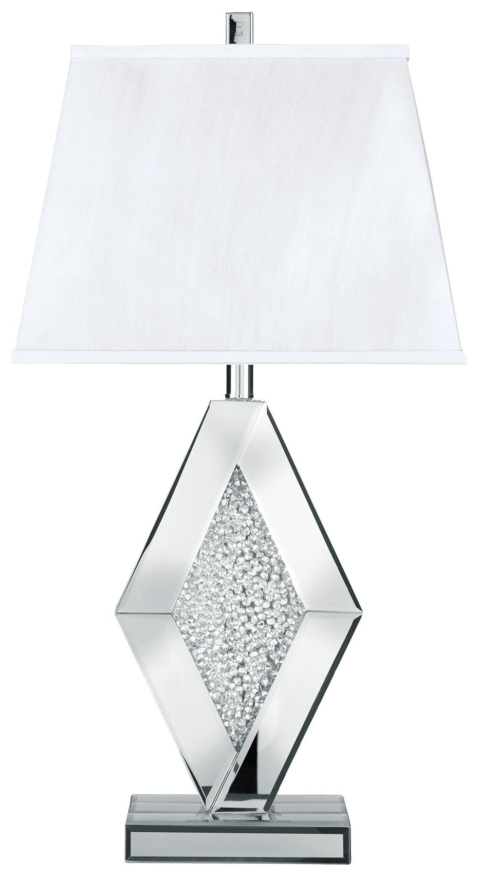 With an elegant array of mirrored glass and crystal beads, this table lamp adds a brilliant touch of wow to any setting. It's topped with a rectangular empire shade for an utterly luxe look.