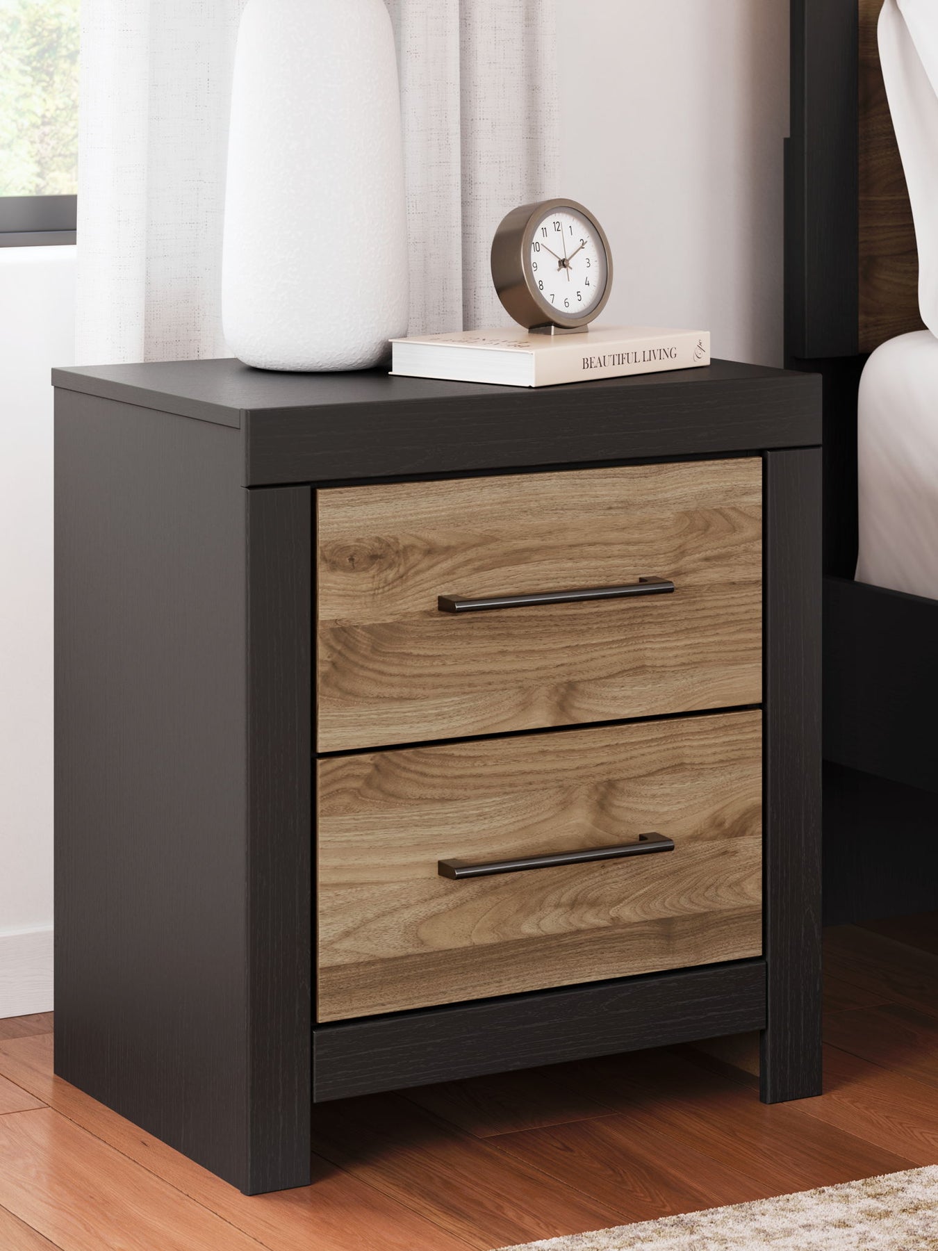 Relaxed yet striking, this nightstand brings casual beauty and function to your dream destination. A delightful two-tone treatment blends a fresh replicated walnut grain with a matte black finish, while sleek handles in an antiqued gunmetal finish lend a contemporary touch. You're sure to love its spacious drawers that glide open and offer plenty of storage for nighttime essentials. USB charging ports conveniently keep your devices powered up.