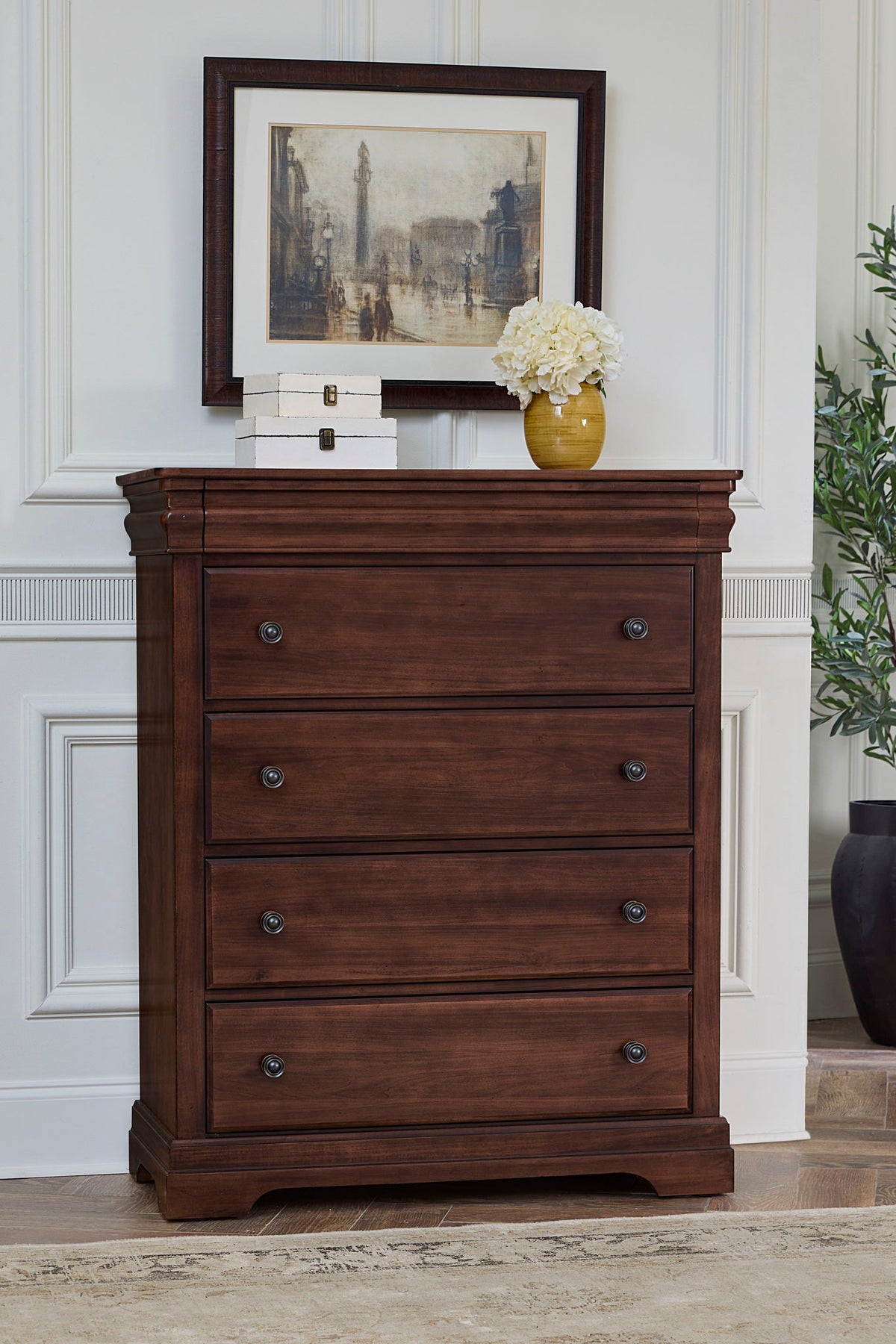 MADE IN USA - Galax, VA - Vista: A classic design with timeless elements. Crafted from Solid Poplar and Veneer, this Louis Phillipe inspired suite features a felt-lined drawer hidden behind the shaped moulding at the top of the dresser and chest. The storage pieces feature burnished brass drawer pulls and dual ball bearing, self-closing drawer guides. There are two classic beds, Mansion and Sleigh, both with an option for footboard storage. Through an innovative program with the Virginia Department of Forestry; Vaughan Bassett replaces every tree needed to produce their furniture. Over two million have been planted over the last 15 or so years.